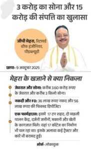 लोकायुक्त पुलिस ने 9 अक्टूबर को लोक निर्माण विभाग (PWD) के पूर्व चीफ इंजीनियर गोविंद प्रसाद (जीपी) मेहरा के भोपाल स्थित आवास समेत 4 ठिकानों पर छापा मारा था। छापे के दौरान मण्पुरम कॉलोनी के निवास से लगभग 8.79 लाख नकद, 50 लाख के सोने-चांदी के आभूषण, 56 लाख की फिक्स डिपॉजिट जानकारी और अन्य कीमती दस्तावेज मिले थे।