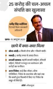 15 अक्टूबर, 2025 को लोकायुक्त पुलिस ने रिटायर्ड जिला आबकारी अधिकारी धर्मेंद्र सिंह भदौरिया के इंदौर, ग्वालियर और उज्जैन स्थित 8 ठिकानों पर एक साथ छापा मारा था। जैसे-जैसे जांच आगे बढ़ी कई चौंकाने वाले खुलासे हुए। भदौरिया के पास 25 करोड़ रुपए से ज्यादा की चल-अचल संपत्ति के दस्तावेज मिले।