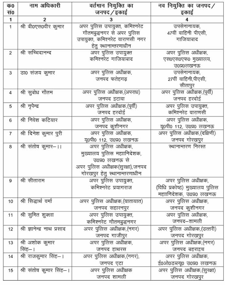 प्रयागराज में पुलिस कमिश्नरेट में तैनात एडिशनल डीसीपी सीताराम को डीजीपी मुख्यालय में लीगल सेल में भेजा गया है। नोएडा में तैनात सुमित शुक्ला को शामली में अपर पुलिस अधीक्षक बनाया गया है। गाजियाबाद में तैनात सच्चिदानंद को लखनऊ एसएसएफ मुख्यालय स्थानांतरित किया गया है।