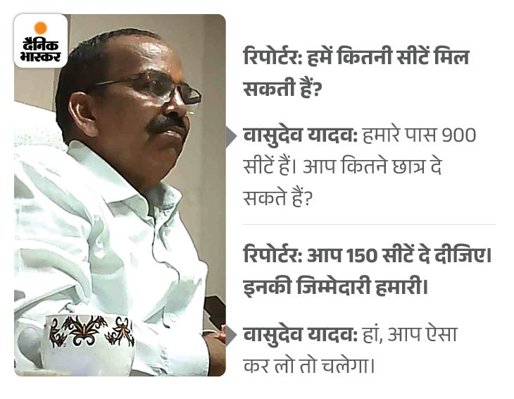 एडमिशन हेड बोला- एक साल का आप रख लो, एक का हम इसके बाद भास्कर की टीम ने एक प्राइवेट कॉलेज के एडमिशन हेड वासुदेव यादव से बात की। यादव ने बताया कि उसके कॉलेज में डिग्री मिल जाएगी, बस परीक्षा देने आना होगा। साथ ही स्कॉलरशिप को लेकर 50-50 के समझौते पर हामी भर दी। यादव से ये भी पूछा कि उसके कॉलेज में 900 सीटें हैं, उसमें से रिजर्व कैटेगरी की कितनी सीटें दे सकते हैं? पढ़िए, बातचीत…
