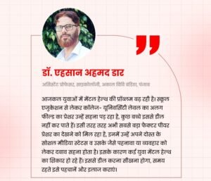डॉ. एहसान अहमद डार वर्तमान में पंजाब की अकाल यूनिवर्सिटी के साइकोलॉजी विभाग में असिस्टेंट प्रोफेसर हैं। उन्होंने बताया कि आजकल के युवा, खासकर स्कूल- कॉलेज में पढ़ने वाले छात्रों में मेंटल हेल्थ की समस्या सबसे ज्यादा है। वे पढ़ाई में प्रतिस्पर्धा के साथ अलग-अलग फील्ड के प्रेशर का बोझ सह रहे हैं। इस तरह के प्रेशर को कई बच्चे सही तरीके से डील नहीं कर पाते हैं, इससे वे मेंटल हेल्थ की बीमारी का शिकार हो जाते हैं। युवाओं के सामने पढ़ाई, जॉब के साथ फैमिली प्रेशर, फाइनेंस प्रेशर, सोशल मीडिया प्रेशर और सबसे ज्यादा पीयर प्रेशर को लेकर दिक्कतों का सामना करना पड़ा रहा है। पीयर प्रेशर में उनसे जुड़े दोस्त के सोशल मीडिया स्टेटस, लाइफ स्टाइल और व्यवहार को फॉलो करने या प्रभावित होने से दिक्कतें आती हैं। इससे जुड़े कई केस सामने आ रहे हैं, जिसमें युवा को पता ही नहीं होता है कि इससे कैसे निपटना है। इससे उनका मेंटल हेल्थ प्रभावित होता है।