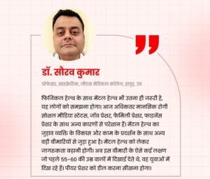 डॉ. सौरव का कहना है कि फिजिकल हेल्थ के साथ मेंटल हेल्थ भी उतना ही जरूरी है, यह लोगों को समझना होगा। मेंटल हेल्थ का जुड़ाव व्यक्ति के विकास और काम के प्रदर्शन के साथ अन्य बड़ी बीमारियों से जुड़ा हुआ है। मेंटल हेल्थ को लेकर जागरूकता बढ़ानी होगी।