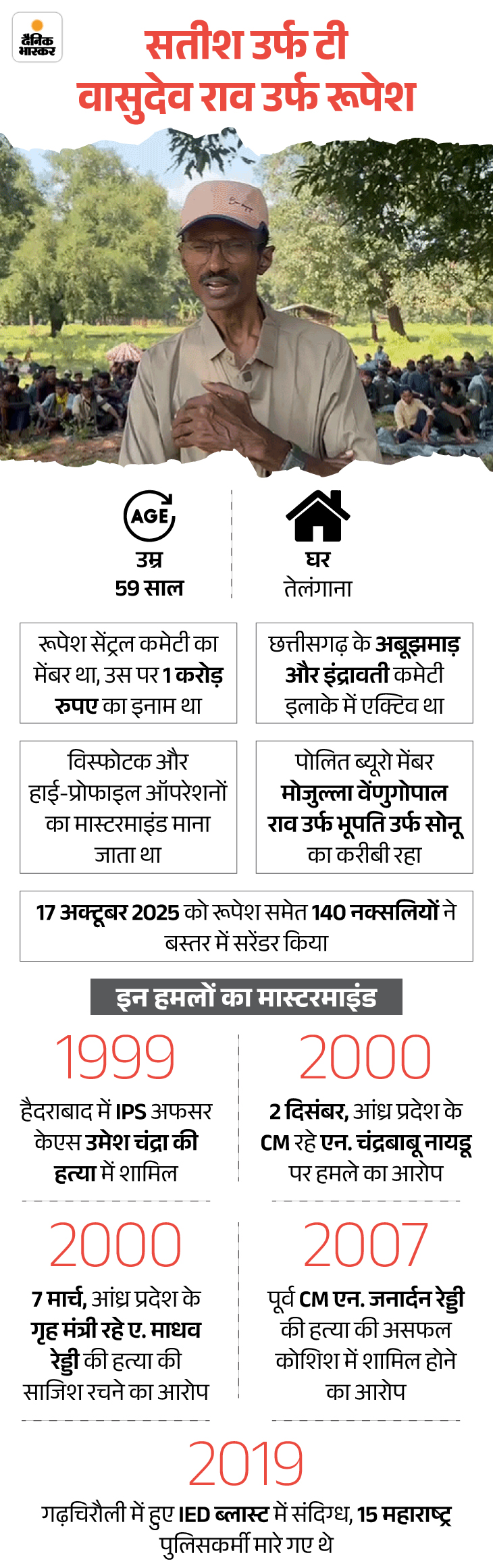 17 अक्टूबर 2025 को छत्तीसगढ़ के बड़े नक्सली लीडर टी वासुदेव राव उर्फ रूपेश ने सरेंडर कर दिया। रूपेश पर 1 करोड़ रुपए का इनाम था। उसके साथ 140 और नक्सलियों ने भी सरेंडर किया। हालांकि ये सब इतना सीधा नहीं, जितना दिखता है।