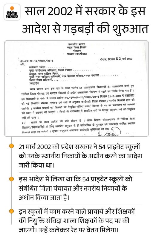 1. निवाड़ी जिले में प्राइवेट स्कूल को निकाय अधीन किया इस गड़बड़ी की शुरुआत सरकार के ही एक आदेश से हुई थी। सरकार ने साल 2002 में 54 साल पुराने प्राइवेट स्कूलों को संबंधित जिला पंचायत और नगरीय निकायों के अधीन करने का आदेश जारी किया था। निवाड़ी जिले (तब टीकमगढ़ जिला) के नैगुवां स्थित शास्त्री हायर सेकेंडरी स्कूल सरकारी जमीन पर संचालित हो रहा था। इस आधार पर इसे 2002 में किसी निकाय के अधीन नहीं किया गया।