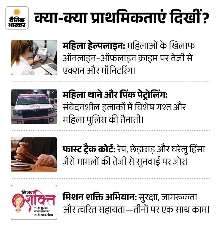 महिलाओं संबंधी अपराधों में सख्ती: एंटी-रोमियो स्क्वॉड, फास्ट-ट्रैक जांच और त्वरित गिरफ्तारी।