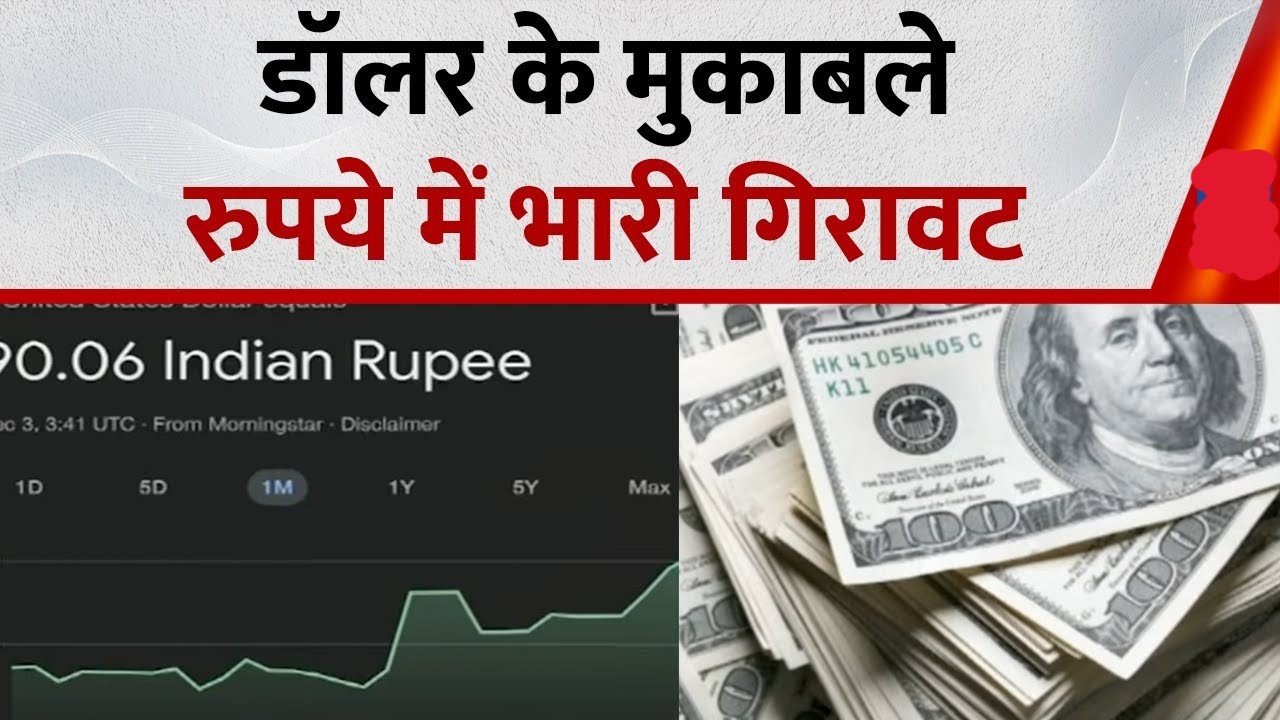 रुपया आज यानी 4 दिसंबर को डॉलर के मुकाबले अब तक के सबसे निचले स्तर पर आ गया है। PTI के अनुसार आज डॉलर के मुकाबले रुपया 28 पैसे गिरकर 90.43 के स्तर पर आ गया है। कल यानी 3 दिसंबर को ये 90.15 के स्तर पर बंद हुआ था।