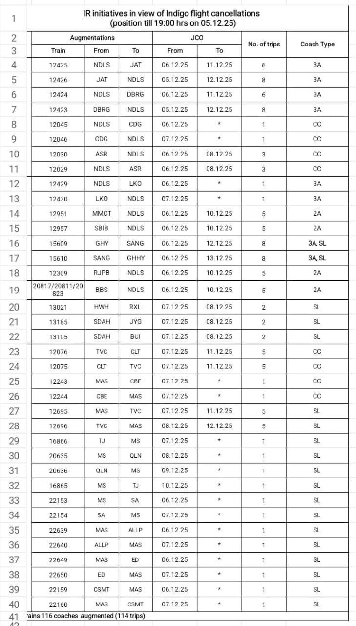 रेलवे ने यात्रियों की सुविधा के लिए बड़ा कदम उठाया है। इंडिगो फ्लाइट के रद्द होने से फंसे लोगों की मुश्किलें कम करने के लिए 37 ट्रेनों में कुल 116 कोच अतिरिक्त जोड़े जाएंगे। इससे यात्रा करने वाले यात्रियों को सीट मिलने में राहत मिलेगी और भीड़ का दबाव भी कम होगा। इसके अलावा रेलवे कई रूटों पर स्पेशल ट्रेन को भी जल्द शुरु करेगा। ताकि यात्रियों को राहत मिल सके।