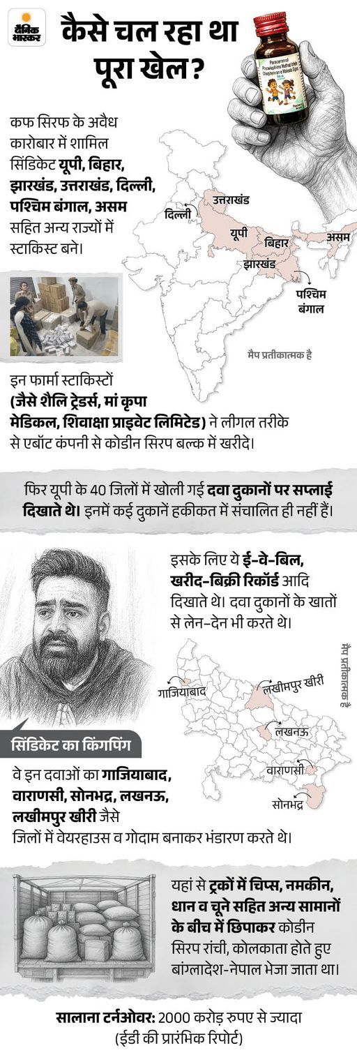 जिससे स्पष्ट हुआ कि इन फर्मों द्वारा संगठित रूप से इन दवाओं का इस्तेमाल दवा के रूप में नहीं, बल्कि नशे में रूप में कराया जा रहा है। लखनऊ, लखीमपुर खीरी, बहराइच से नेपाल और वाराणसी, गाजियाबाद आदि से बाग्लादेश में इसकी सप्लाई नशे के लिए हो रही है।