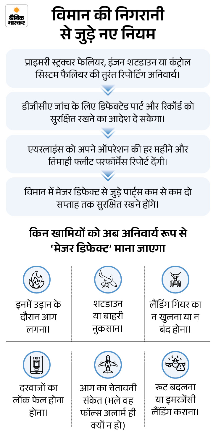 - कंपनी को किसी भी ‘मेजर डिफेक्ट’ की सूचना तुरंत DGCA को फोन पर देनी होगी। 72 घंटे में विस्तार से रिपोर्ट भेजनी होगी। डिफेक्ट तीन बार दोहराए जाने पर उसे ‘रिपीटेटिव डिफेक्ट’ माना जाएगा और उस पर अलग से विशेष जांच शुरू होगी।