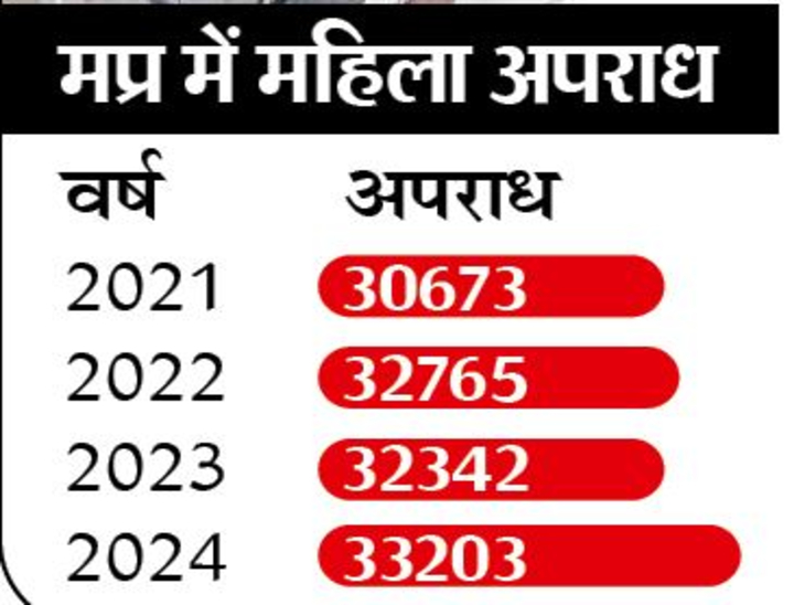 महिलाओं के खिलाफ अपराधों को लेकर मप्र में हालात नहीं सुधर रहे हैं। साल 2021 में महिला अपराधों के 30,673 मामले सामने आए थे। 2024 में ये आंकड़ा 33,203 पर पहुंच गया। यानी 8.25% की बढ़ोतरी। ऐसे अपराध रोकने के लिए सरकार और पुलिस के स्तर पर तमाम कदम उठाने के दावे किए गए, लेकिन ये कारगर नहीं हो पाए। निर्भया मोबाइल वैन सड़कों से गायब है तो स्कूल-कॉलेज के पास पुलिस बूथ खाली पड़े हैं।