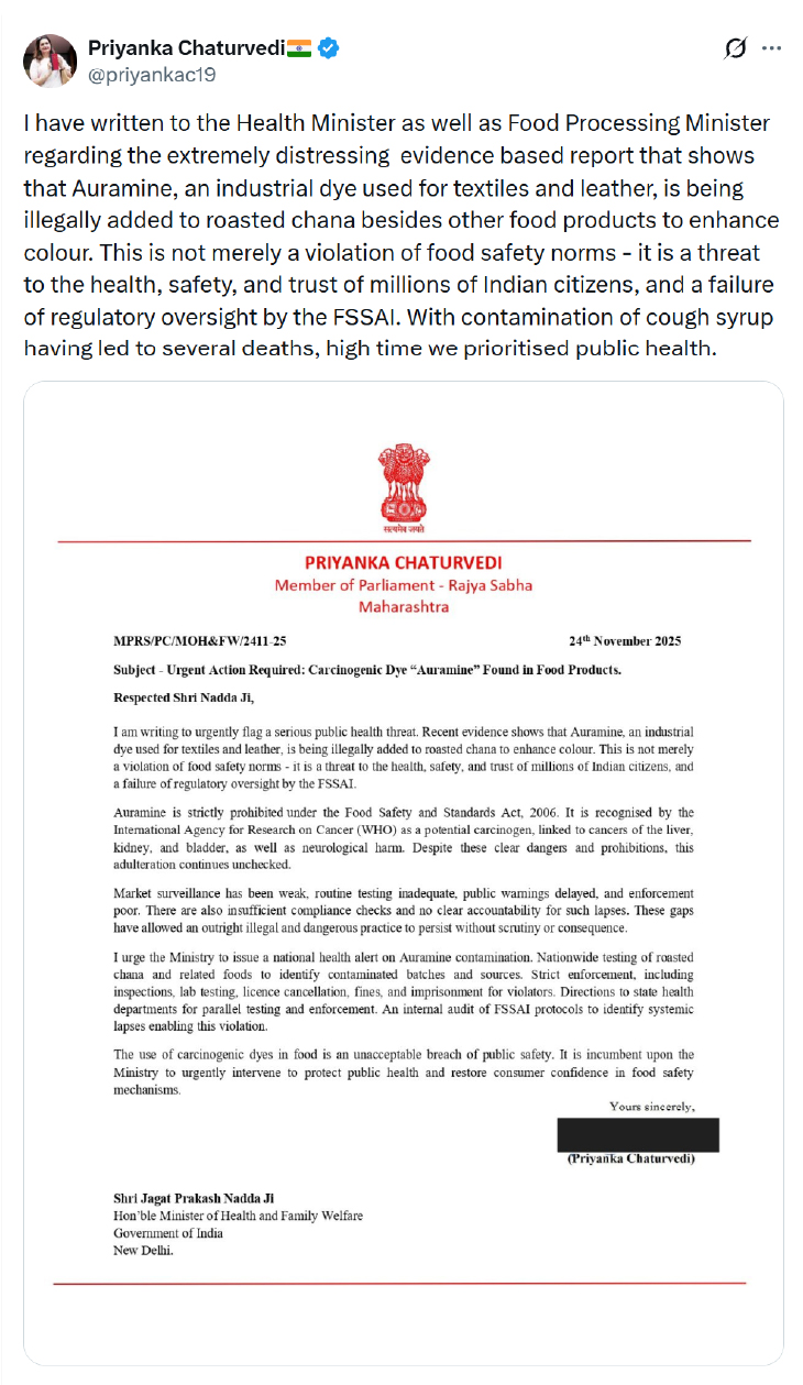 जवाब- प्रियंका चतुर्वेदी ने अपने पत्र में लिखा कि देशभर में बेचे जाने वाले भुने चनों में ऑरामाइन-O नाम की खतरनाक इंडस्ट्रियल डाई मिलाई जा रही है, जो पूरी तरह गैर-कानूनी और कैंसरकारी है। उन्होंने आगाह किया कि यह सिर्फ मिलावट नहीं, बल्कि करोड़ों लोगों की सेहत से खिलवाड़ है।