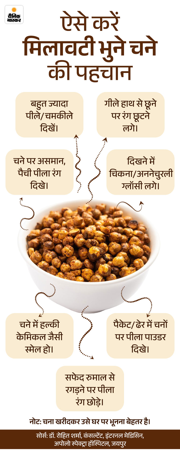 जवाब- इसके लिए चने के रंग, खुशबू और सतह को ध्यान से देखें। अगर भुने चने का पीला रंग बहुत चमकीला हो, हाथ या रुमाल से छूने पर रंग उतरने लगे या उसमें केमिकल जैसी गंध आए तो मिलावट की आशंका है। नीचे दिए ग्राफिक से मिलावटी भुने चने को पहचानने के तरीके समझिए-