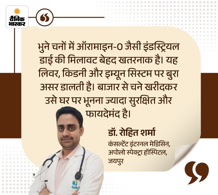 चने में मिलाई गई ये डाई चने को चमकीला और आकर्षक बना देती है, जिससे वे देखने में अच्छे और खाने में ज्यादा कुरकुरे लगते हैं। एक्सपर्ट बताते हैं कि ऐसे चने खाने से कैंसर का खतरा बढ़ता है। आगाह किया कि यह सिर्फ मिलावट नहीं, बल्कि करोड़ों लोगों की सेहत से खिलवाड़ है।