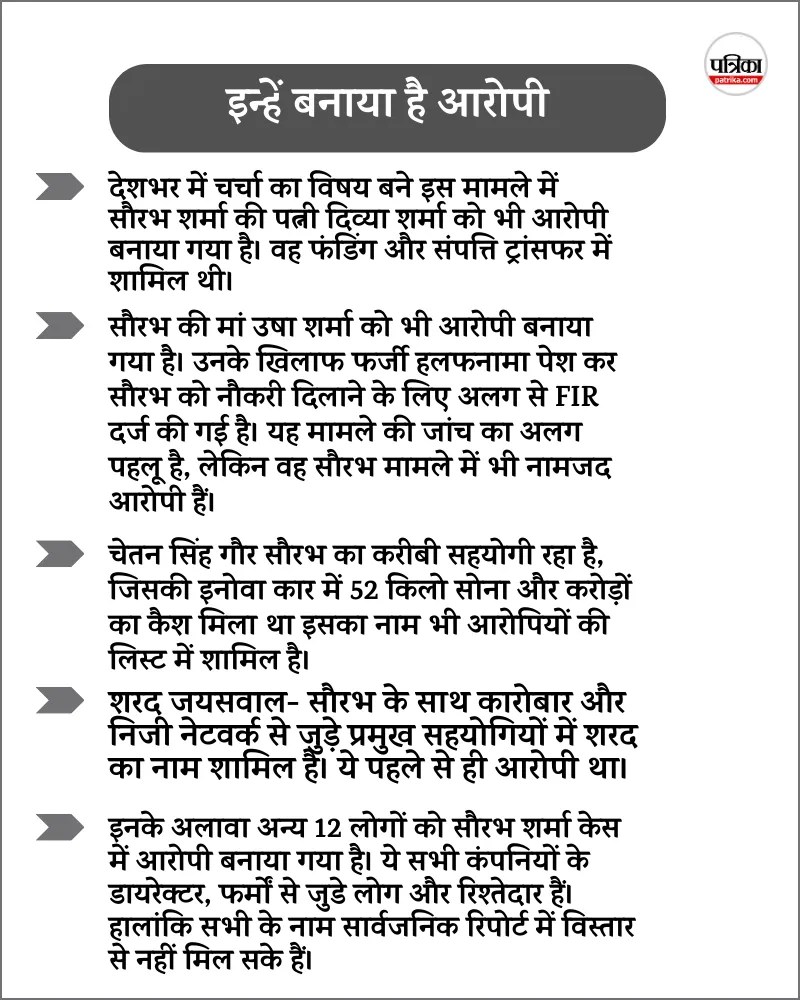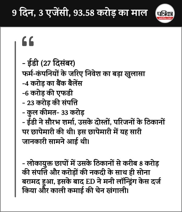 प्रवर्तन निदेशालय (ED) ने 27 दिसंबर को सौरभ शर्मा और उसके सहयोगी चेतन सिंह गौर, शरद जायसवाल, रोहित तिवारी के ठिकानों पर भी छापामारी की थी। सौरभ के परिजन और दोस्तों के खातों में 4 करोड़ का बैंक बैलेंस मिला। इसके अलावा 23 करोड़ की संपत्ति भी ED ने जांच के दायरे में ली थी।