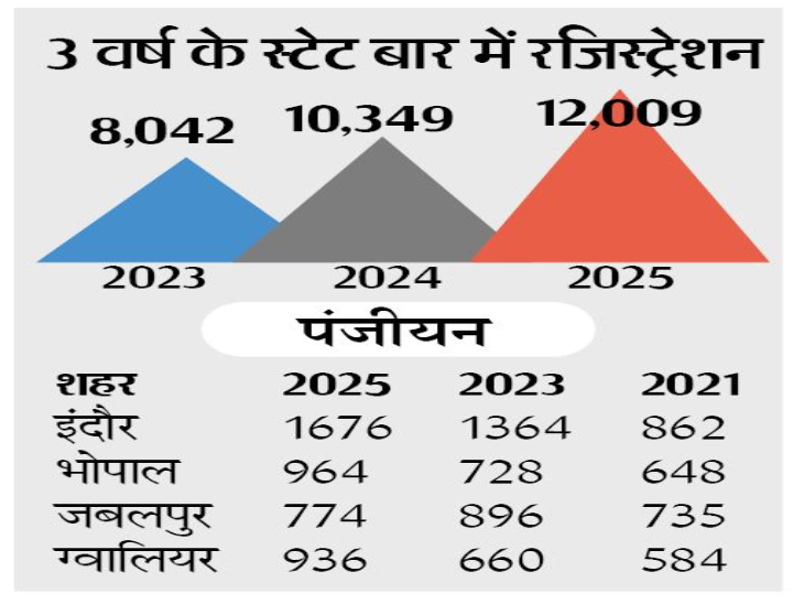 प्रदेश के युवाओं को वकालत भा रही है। वर्ष 2025 खत्म होना बाकी है और मप्र स्टेट बार काउंसिल में अब तक 12 हजार से ज्यादा वकीलों के रजिस्ट्रेशन हो चुके हैं। साल खत्म होने तक संख्या में बढ़ोतरी तय है। ये आंकड़ा वर्ष 2024 में 10,349 और 2023 में 8,042 था।