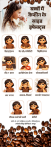 जवाब- बच्चों में इसका असर तेज होता है। यह उनकी नींद को बाधित कर सकता है, दिल की धड़कन बढ़ा सकता है और बेचैनी या चिड़चिड़ापन पैदा कर सकता है। नीचे दिए ग्राफिक में बच्चों में कैफीन के साइड इफेक्ट्स समझिए-