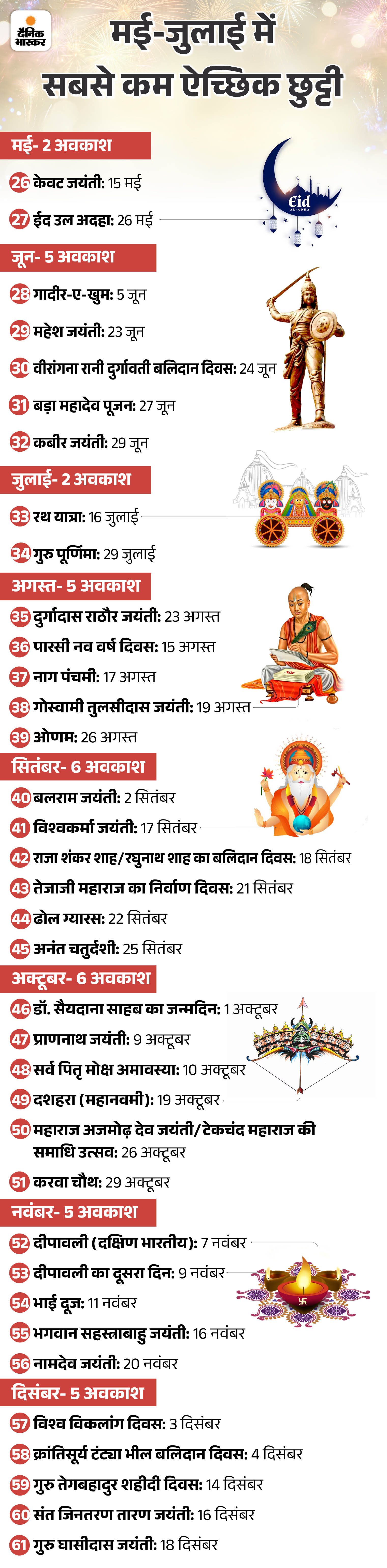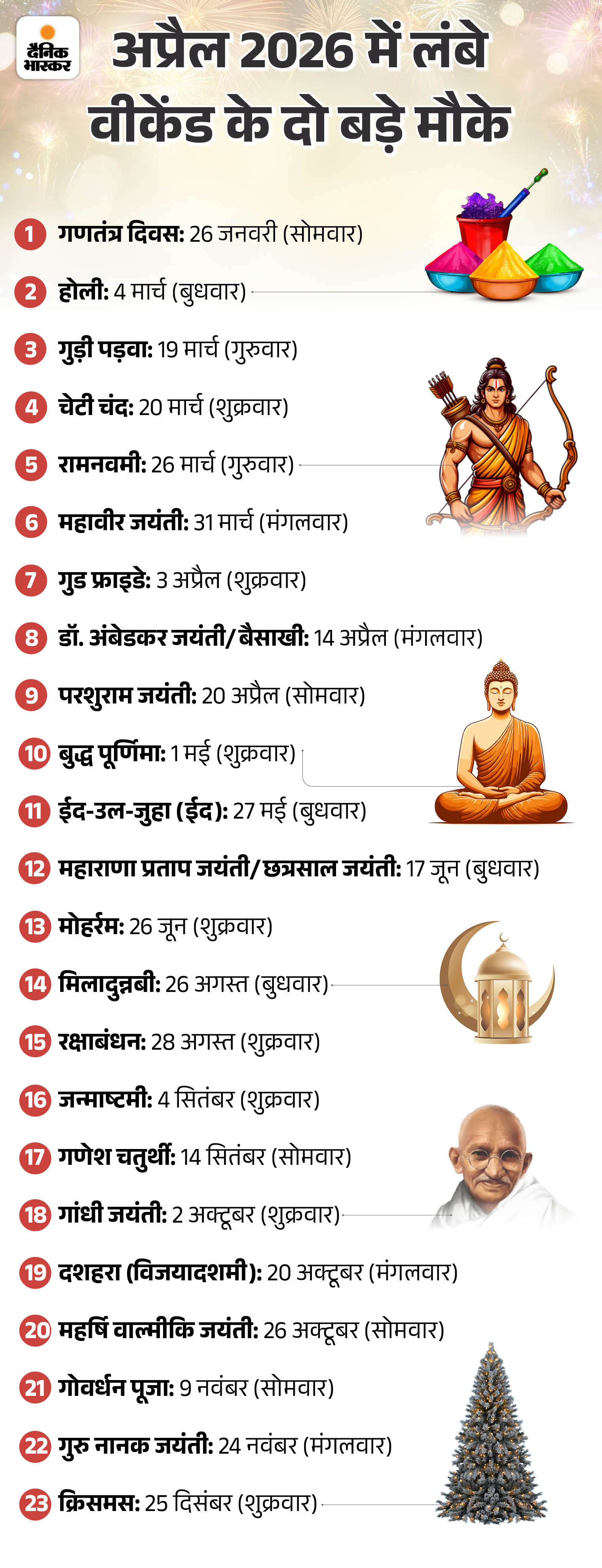 हालांकि 2026 में 6 महत्वपूर्ण त्योहार और जयंतियां शनिवार या रविवार को पड़ रही हैं, जिससे कर्मचारियों को अलग से छुट्टी का लाभ नहीं मिल पाएगा। इन प्रमुख त्योहारों के वीकेंड पर पड़ने से कर्मचारियों को लगातार मिलने वाली छुट्टियों के अवसर कम हो गए हैं, जिसका असर उनके घूमने-फिरने या लंबे अवकाश की योजनाओं पर पड़ सकता है।