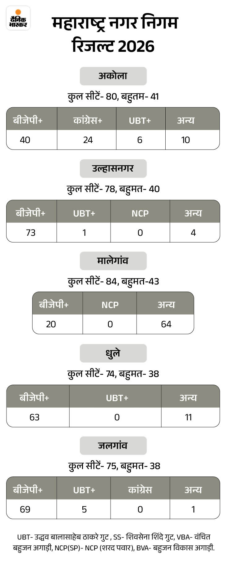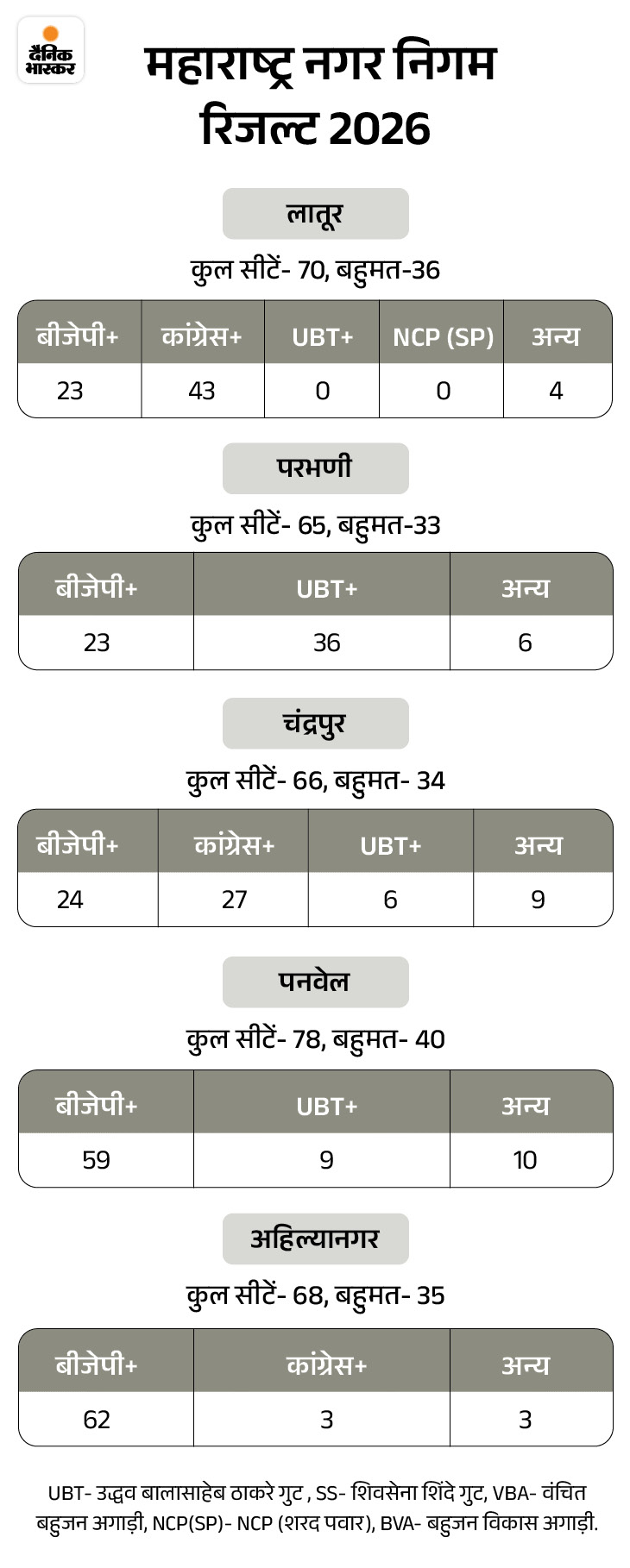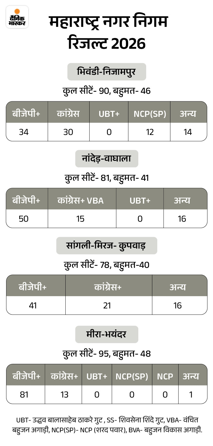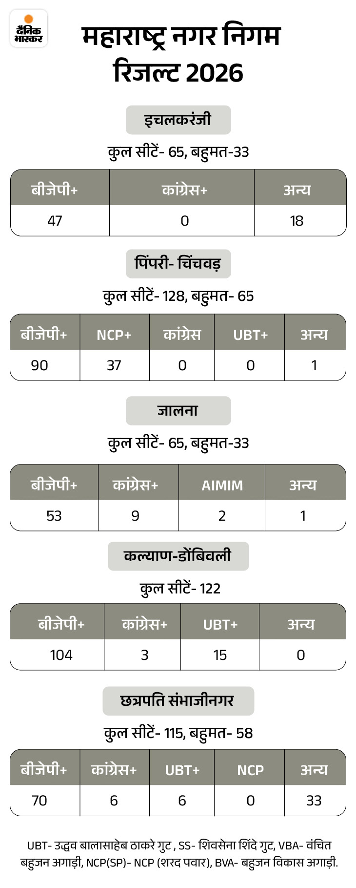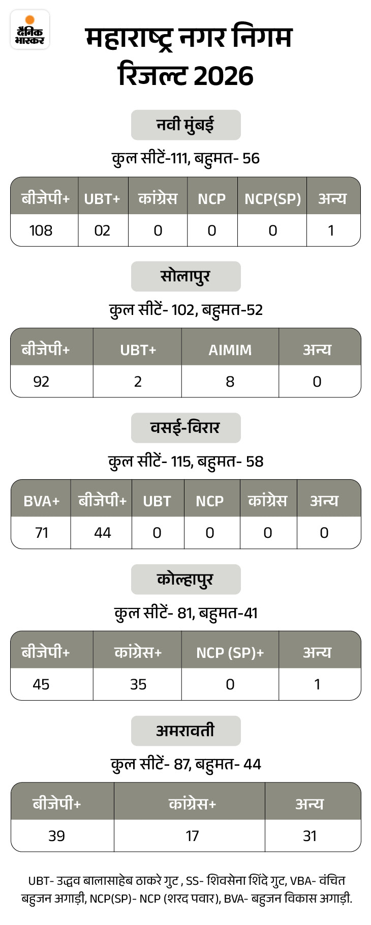 वहीं, उसके नेतृत्व वाले महायुति गठबंधन ने 8 निगमों में जीत हासिल की। इस तरह भाजपा गठबंधन को 25 नगर निगमों में जीत दर्ज हुई है।