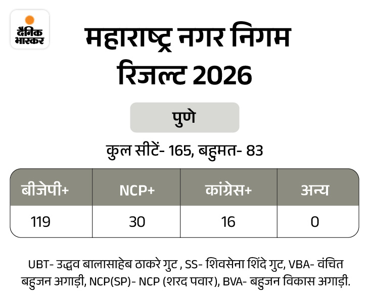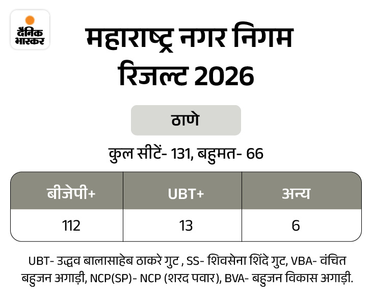 ठाणे नगर निगम में BJP को 28, शिवसेना शिंदे को 75 सीटें जीतीं। यहां शिंदे गुट का मेयर बनना तय है। अजित की NCP को यहां 9 सीटें ही मिल सकीं। ठाकरे ब्रदर्स के गठबंधन को केवल एक ही सीट मिली।