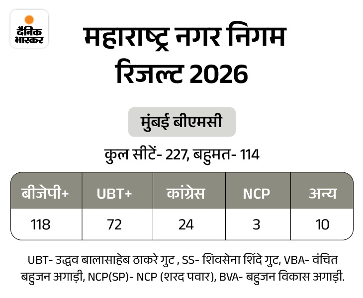 227 सदस्यों वाली BMC में BJP ने 89 और सहयोगी शिवसेना ने 29 सीटें जीतीं। जबकि उद्धव की शिवसेना को 65 और MNS को 6 सीटें मिलीं। कांग्रेस और वंचित बहुजन अघाड़ी (VBA) के गठबंधन को 24 सीटें मिलीं। AIMIM को 8, NCP को 3, समाजवादी पार्टी को 2, और NCP (SP) को सिर्फ 1 सीट मिली। BMC में पहली बार BJP का मेयर बनाया जा सकता है।