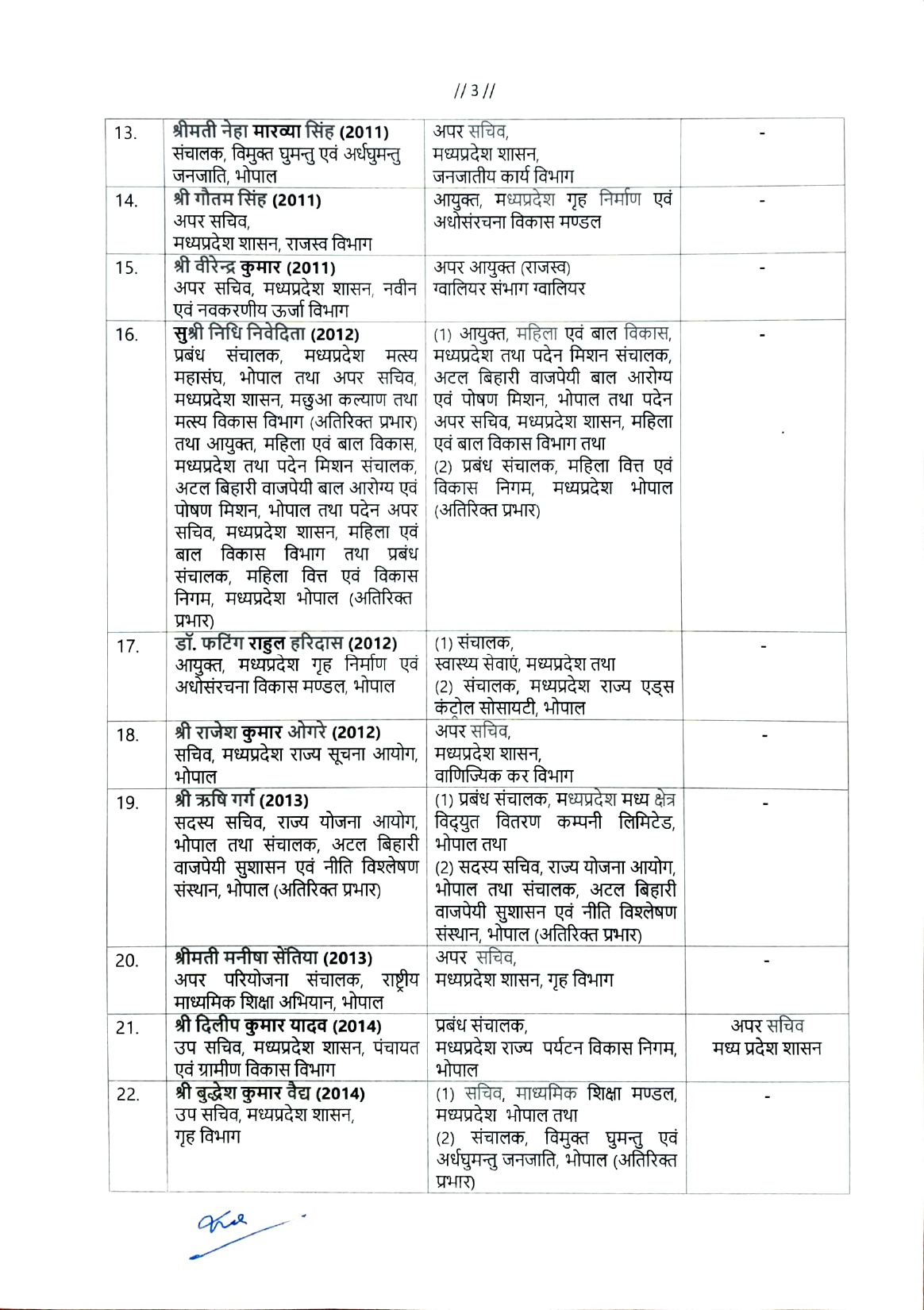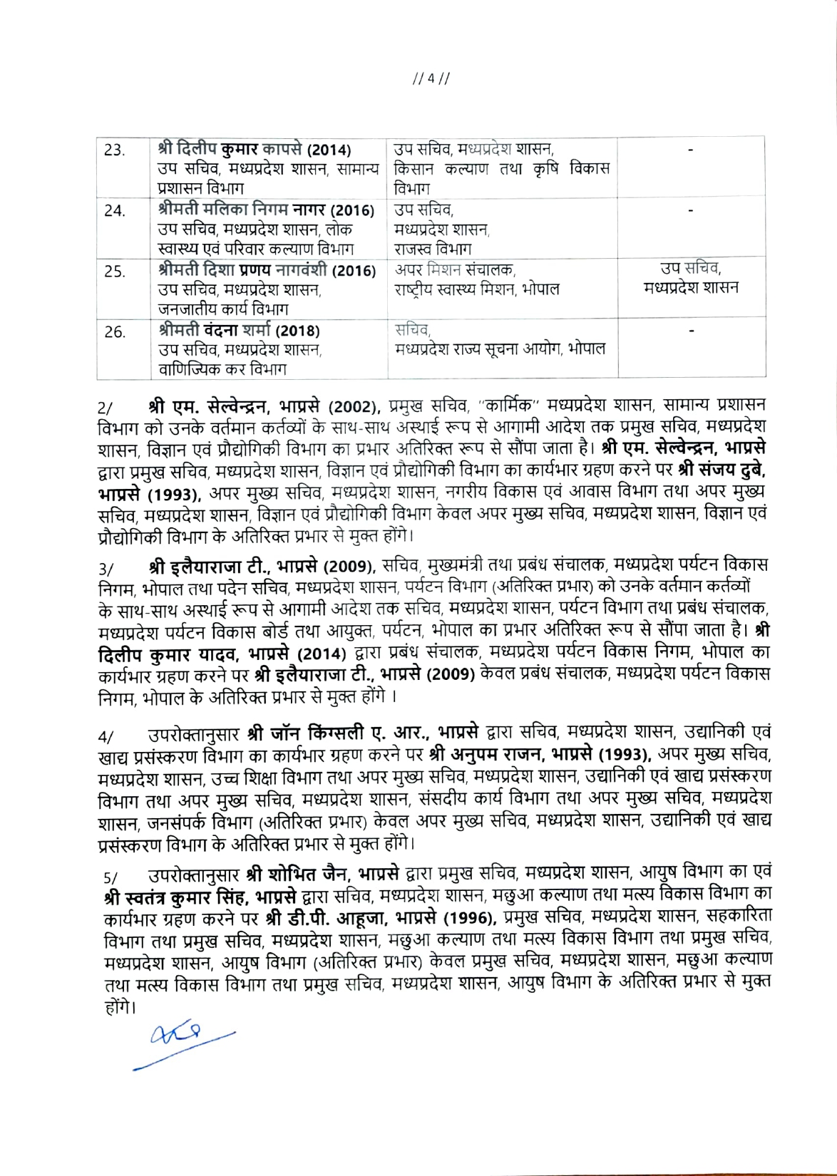 वहीं, विशेष गढ़पाले (2008 बैच) सचिव, ऊर्जा विभाग एवं एमपी पावर मैनेजमेंट कंपनी, जबलपुर के साथ मध्य प्रदेश पूर्व क्षेत्र विद्युत वितरण कंपनी के प्रबंध संचालक की जिम्मेदारी भी संभालेंगे। तरुण राठी (2010 बैच) को आयुक्त, स्वास्थ्य सेवाएं से हटाकर आयुक्त, आदिवासी विकास बनाया गया है। वहीं, शोभित जैन को खाद्य विभाग के सचिव पद से पशुपालन विभाग के प्रमुख सचिव पद पर भेजा गया है।