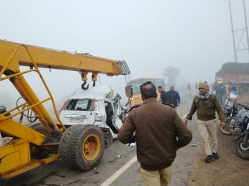 ग्वालियर में घने कोहरे के बीच भीषण सड़क हादसा हो गया। भिंड रोड हाईवे पर बंटू ढाबा के सामने तेज रफ्तार ट्रक ने कार को जोरदार टक्कर मार दी। हादसा इतना भीषण था कि कार सवार चार लोगों की मौके पर ही मौत हो गई। मृतकों में दो महिलाएं और दो पुरुष शामिल हैं।