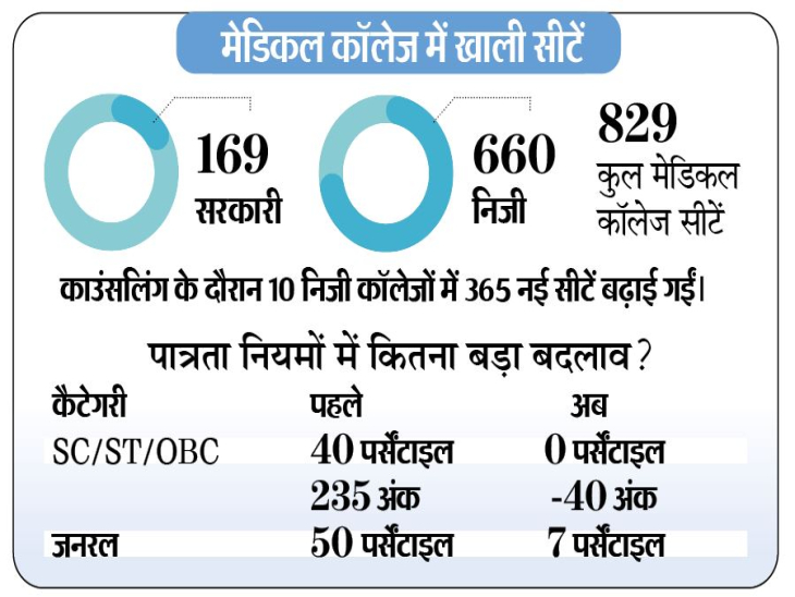 पात्रता नियमों में छूट के चलते ये सभी उम्मीदवार अब काउंसलिंग के लिए योग्य माने जा रहे हैं। अभी प्रदेश के सरकारी और निजी मेडिकल कॉलेजों में एमडी-एमएस की 829 सीटें दो राउंड की काउंसलिंग के बाद भी खाली हैं। सीटें भरने के दबाव में कट-ऑफ इतना नीचे लाया गया कि पहले अयोग्य माने जा चुके उम्मीदवार भी सिस्टम में वापस आ गए।