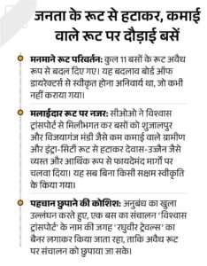 - बोर्ड को अंधेरे में रखा: पुरानी बसों को बेचने, नई बसें खरीदने की अनुमति देने और सबसे महत्वपूर्ण, बसों के रूट बदलने जैसे बड़े फैसले ‘बोर्ड ऑफ डायरेक्टर्स’ की बैठक की प्रत्याशा में ले लिए गए। यह एक सामान्य प्रक्रिया हो सकती है, लेकिन आरोप है कि बाद में इन प्रस्तावों को जानबूझकर बोर्ड के समक्ष कभी प्रस्तुत ही नहीं किया गया। यह कदम प्रथम दृष्टया मिलीभगत और आपराधिक षड्यंत्र को प्रमाणित करता है।