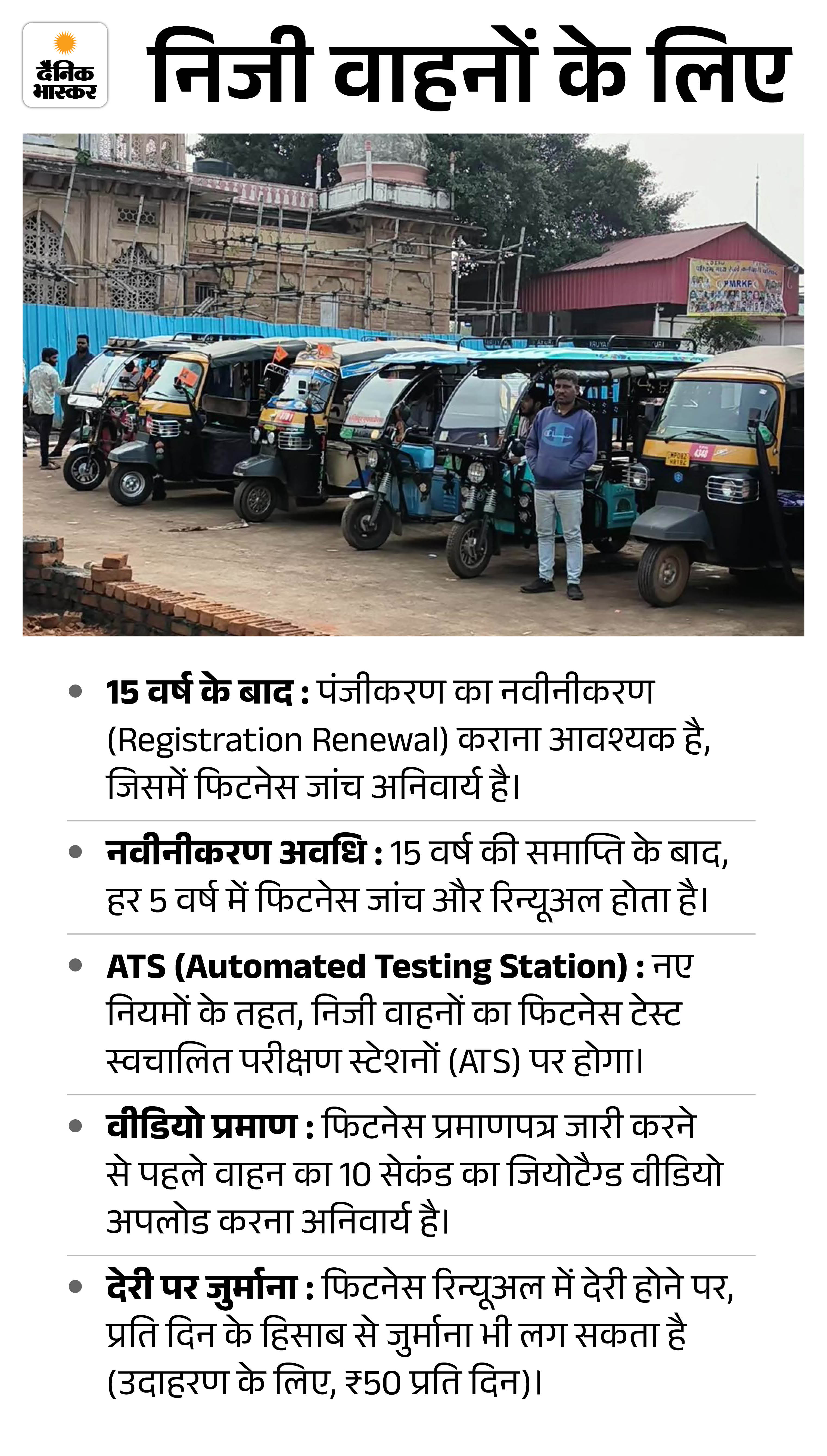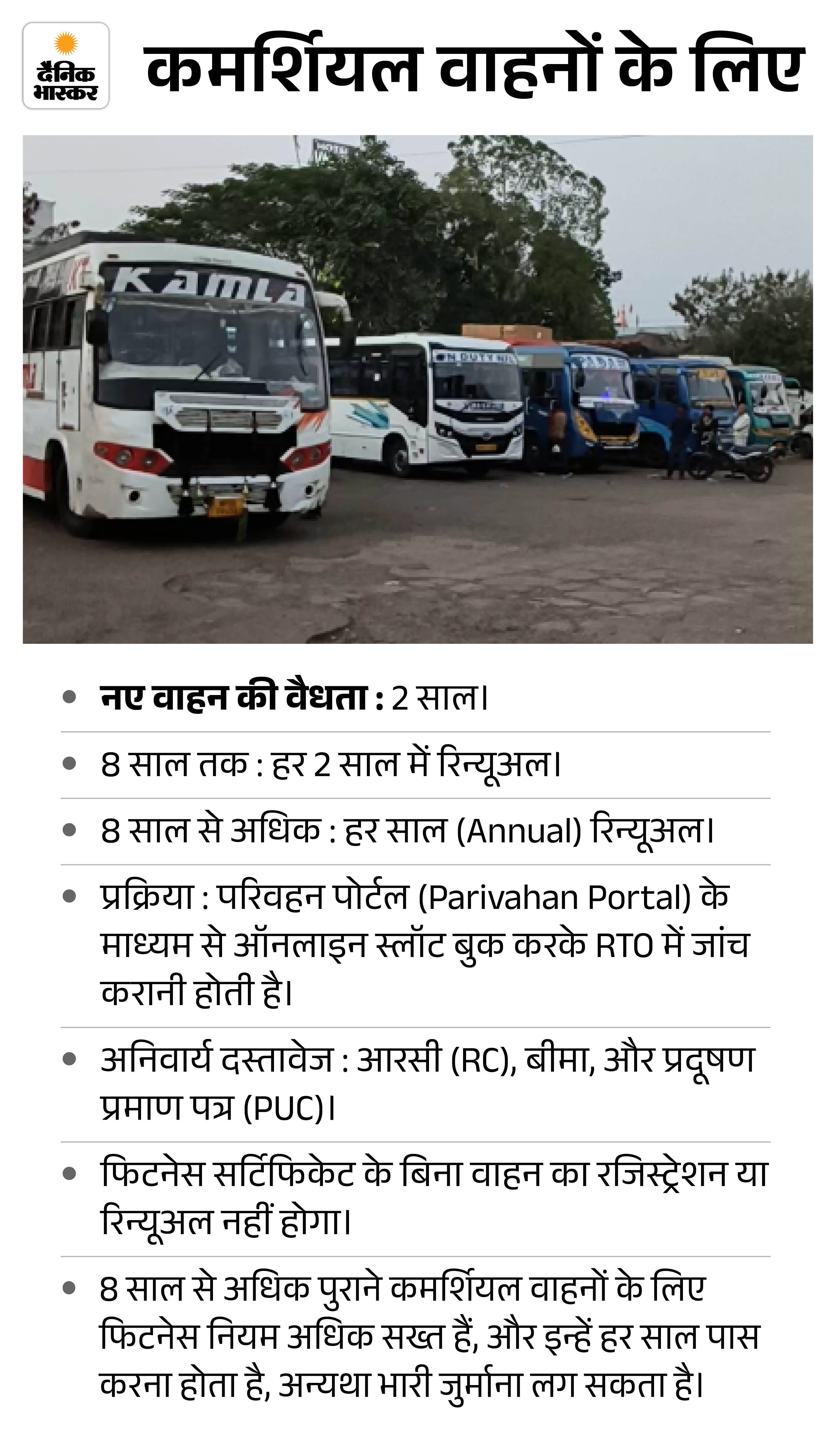 वहीं, नए व्यावसायिक (कमर्शियल) वाहनों के लिए फिटनेस प्रमाण पत्र शुरुआती 2 साल के लिए मान्य होता है। इसके बाद, 8 साल पुराना होने तक इसे हर 2 साल में रिन्यू कराना अनिवार्य है। 8 साल से अधिक पुराने वाहनों के लिए फिटनेस का नवीनीकरण हर साल कराना होता है।