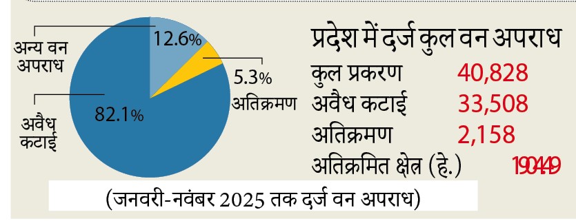 राजधानी भोपाल में वन अपराधों का ग्राफ लगातार बढ़ रहा है। जनवरी से नवंबर 2025 तक पूरे प्रदेश में दर्ज वन अपराधों में भोपाल फारेस्ट सर्किल 4424 मामलों के साथ पहले नंबर पर रहा। इनमें 2638 अवैध कटाई के प्रकरण शामिल हैं।